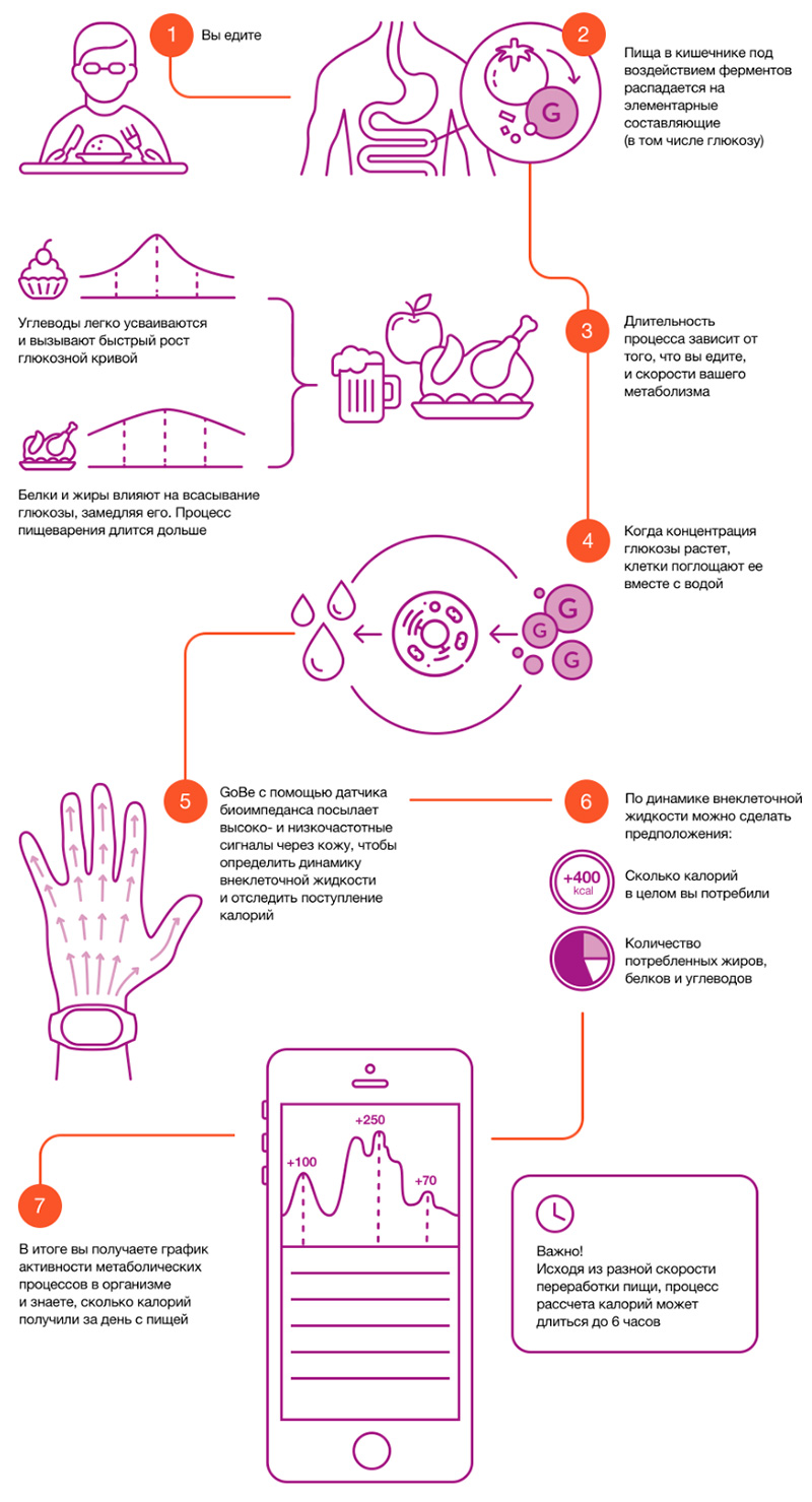 Неинвазивный глюкометр они так и не сделали (в мире немало компаний пытаются решить эту очень важную задачу), лаборатория обанкротилась, из нее ушли восемь человек, которые сделали свою компанию, где, пользуясь созданными наработками, стали создавать совершенно иное устройство, которое умело бы определять потребленные и потраченные калории. Заодно устройство было решено снабдить возможностями фитнес-браслета.