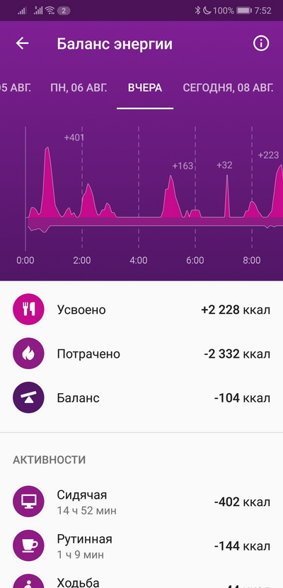 Браслет также показывает распределение полученных белков, углеводов и жиров, но вот тут с точностью у меня были определенные сомнения - не совпадало довольно сильно.