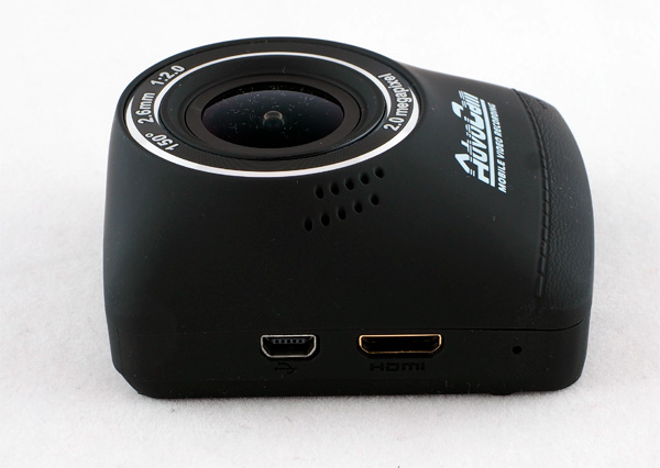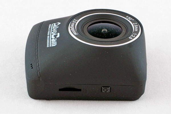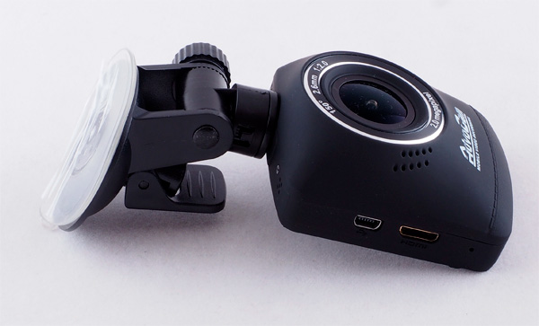 Видеорегистратор небольшой по размеру (по ширине - с коробок спичек) с большим объективом. Покрыт черным матовым пластиком софт-тач.