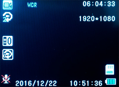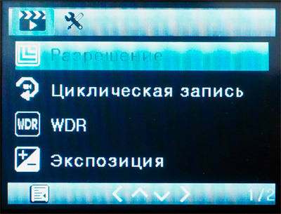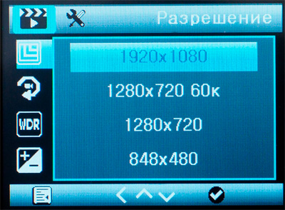 Разрешение можно выставлять от FullHD до 640×480. Разумеется, чем меньше разрешение, тем больше можно записать на карту памяти (ролики будут меньшего размера) и тем хуже будет качество записи.