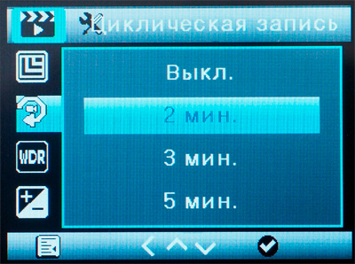 Настройка длины ролика. Запись, как обычно, делается циклично: при заполнении карты памяти новые ролики вытесняют самые старые.