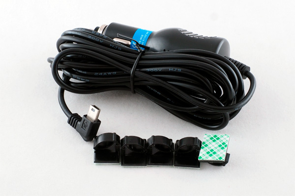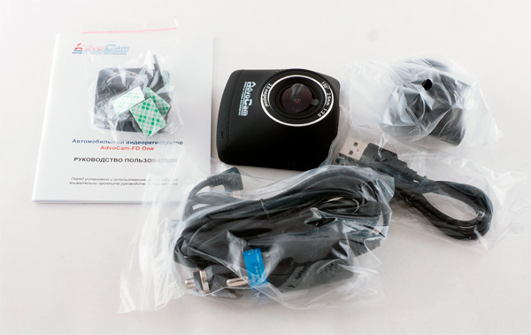 В комплекте - только самое необходимое: видеорегистратор, длинный кабель питания с автомобильным адаптером, крепление для кабеля с двухсторонней лентой, кабель USB-miniUSB, держатель с присоской.