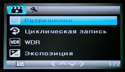 При нажатии кнопки меню появляются настройки видеорегистратора. Там две закладки - съемка и другие настройки. Причем если включен режим видео, то выводятся настройки именно для видео, а если включен режим фото, то настройки выводятся для фото - в кучу они не смешиваются.