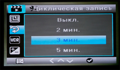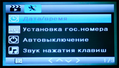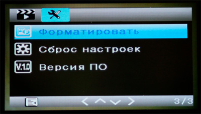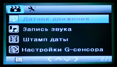 Датчик движения - включен или выключен. Запись звука - включена или выключена. Подстройка G-сенсора нужна для случаев, когда этот сенсор срабатывает на каждой кочке: тогда следует уменьшить его чувствительность. При срабатывании G-сенсора видеорегистратор пишет ролик с предшествующими и последующими событиями в отдельную папку.