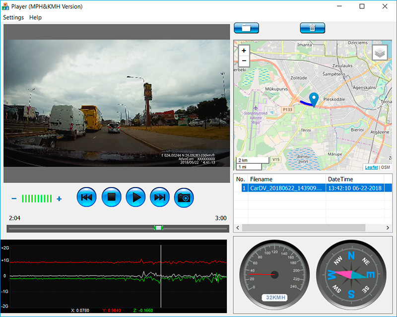 С помощью специальной программы, прилагаемой на диске, можно посмотреть полный комплект: трекинг маршрута по карте, срабатывание G-сенсора.