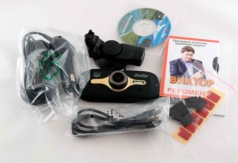 Комплект поставки: видеорегистратор, кронштейн на присоске, автомобильный адаптер питания, руководство пользователя, кабель USB-miniUSB, крепеж для кабеля питания, диск с ПО, брошюра с разъяснением от телеведущего и президента Коллегии правовой защиты автомобилистов Виктора Травина "Что делать с данными видеорегистратора при ДТП".