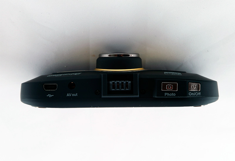 На верхнем торце: кнопка включения-выключения, кнопка "Сделать фото", контактная группа для держателя, выход AV и выход miniUSB. Кстати, я интересовался у разработчиков, почему до сих пор делается вход miniUSB, а не microUSB, - мне ответили, что miniUSB толще и поэтому более прочный.