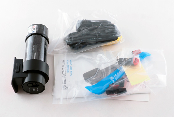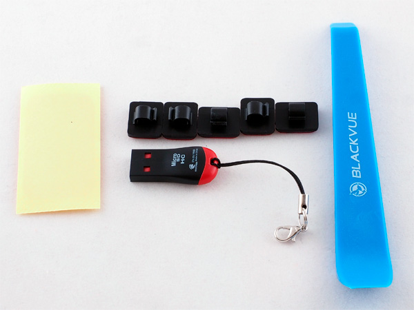 Комплект поставки: видеорегистратор со съемным кронштейном, кабель питания, устройство для считывания microSD (его можно носить в качестве брелока), пять кабельных зажимов, пластиковый рычажок для укладывания кабеля под обшивку автомобиля, фирменная карта BlackVue microSD на 16 гигабайт, дополнительная двухсторонняя клейкая лента для кронштейна, руководство пользователя.