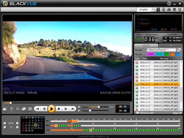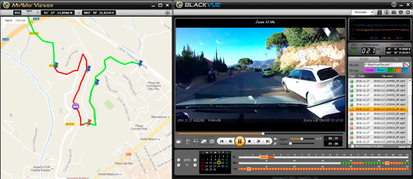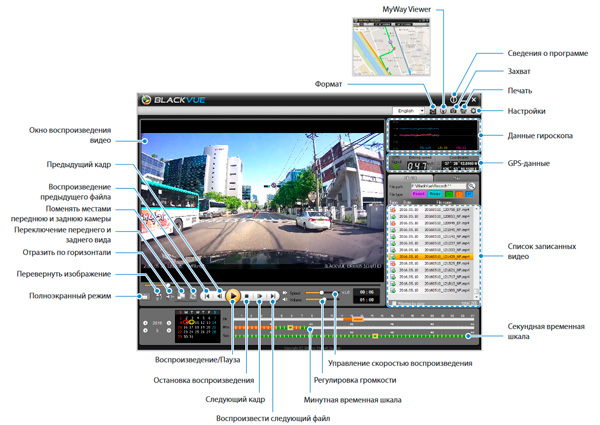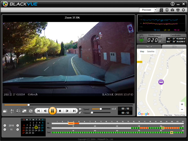 Надо сказать, что плеер - очень удобный и информативный. Календарь, шкалы часов, минут и секунд, деление роликов на нормальный режим записи, режим паркинга и запись по воздействию, создание скриншотов и прочие полезности.