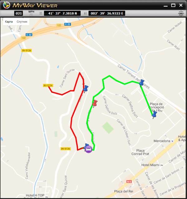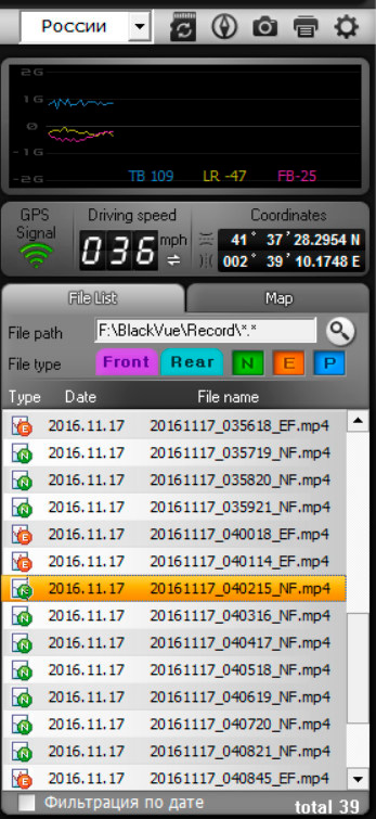 В правой части: показания трехосевого датчика, сигнал GPS, скорость, координаты. Видеотреки можно отбирать по камерам или видам записи.