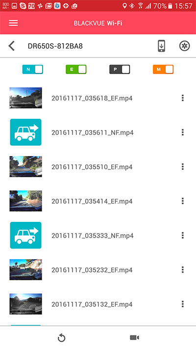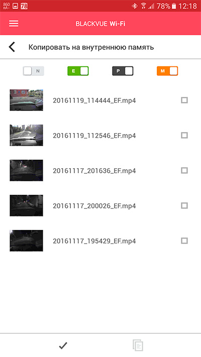 Щелкаем по пиктограмме камеры - нам показывают список записанных роликов точно так же, как при подключении к камере напрямую. И эти ролики также можно фильтровать по различным режимам записи.