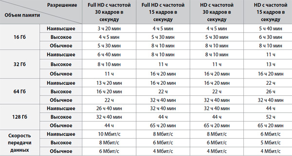 Вот табличка, показывающая, сколько часов и минут записи помещается на карты памяти различной емкости при различном качестве видео.