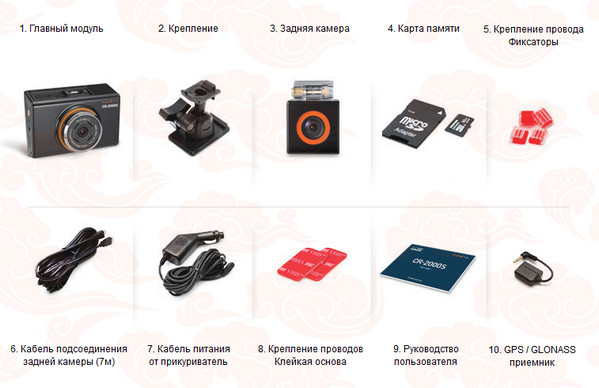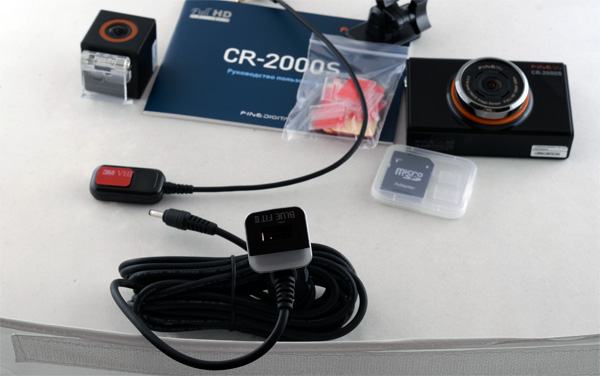 Внутри: передняя камера, задняя камера с креплением, внешний GPS-приемник, адаптер питания от прикуривателя с кабелем четыре метра, семиметровый кабель для соединения с задней камерой, крепление на стекло для передней камеры, три полоски двусторонней клейкой ленты 3М (одна запасная), четыре клипсы для крепления кабеля с клейкой лентой на основании, карта microSD 32 Гб, инструкция.