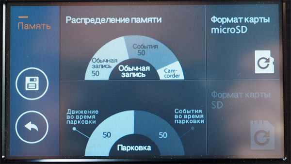 Настройка распределения памяти по разным событиям. Обратите внимание, что, например, на вторую карту можно записывать только события и движения при парковке.