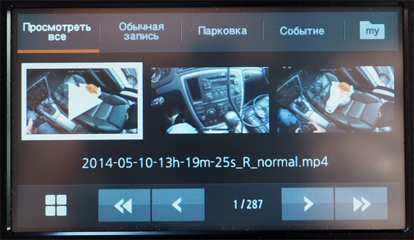 Встроенный плеер видеорегистратора также очень удобен: записи можно отбирать по событиям, парковке, ручной записи. Выдается предпросмотр трех роликов, причем записи сразу разбиты на четыре категории, что облегчает выбор.