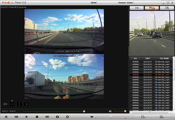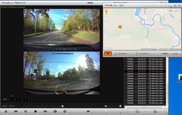 Плеер позволяет синхронно просматривать записи сразу с двух камер (в списке по умолчанию он выдает записи только с передней камеры, чтобы пользователь не путался, а при воспроизведении автоматом подцепляет запись и с задней камеры). Также там на карте Google выдаются текущие координаты GPS, если они были записаны.