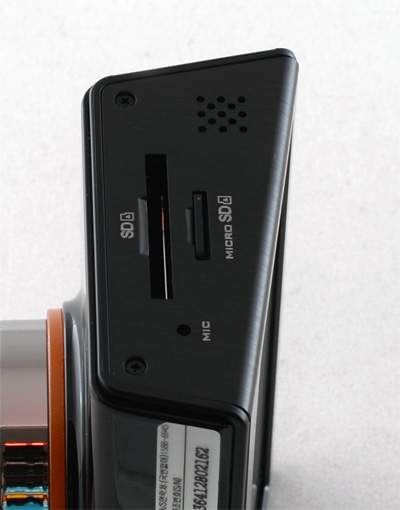 Правый торец: слоты для карт памяти SD и microSD, микрофон, динамик. На какую карту вести запись - можно выбрать через меню. Вторая карта может служить для того, чтобы, например, после инцидента на нее сбросить запись и отнести карту инспектору дорожного движения.