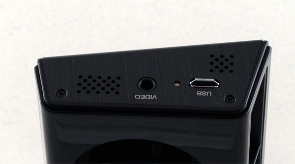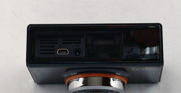Верхний торец: выход miniUSB для подключения задней камеры, вход адаптера питания, посадка под крепление на стекле.