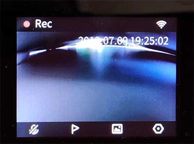 Значок записи, значок Wi-Fi, дата и время. В нижней строке - назначение кнопок: включение-выключение записи аудио, запись аварийного видео (оно будет защищено от удаления), переход в режим просмотра записей, настройки.