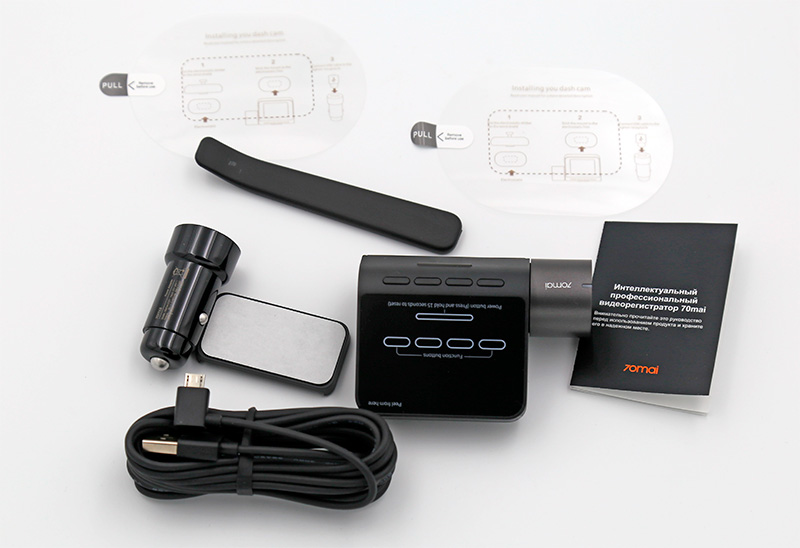 Комплект поставки: видеорегистратор, автомобильный адаптер с двумя USB-портами, кабель USB - microUSB, инструкция на русском, держатель с лентой 3М, лопатка для снятия держателя с липкой лентой. Кстати, лопатка эта очень и очень нелишняя, руками держатель снять невозможно.