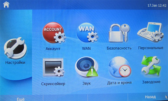 Вызываем пиктограмму "Аккаунт" (именно там вводятся нужные нам данные), после чего система потребует ввести пароль. По умолчанию во всех телефонах установлены логин "admin" и пароль "admin" - его и нужно ввести.