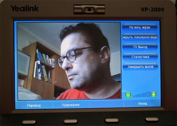 В процессе звонка кроме абонента вы также можете видеть уменьшенное изображение с вашей камеры. Также вам доступны обычные для звонка возможности: удержание, перевод звонка на другой аппарат. Видео можно открыть на весь экран, закрывать локальное видео, выводить изображение через ТВ-выход (например, на экран телевизора).