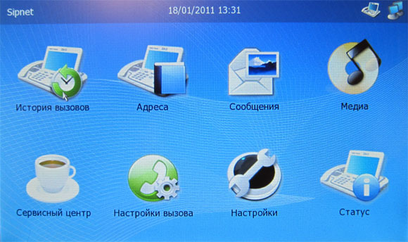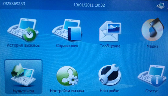 Во втором окне появляются всякие дополнительные пиктограммы - воспроизведение мультимедиа, настройки вызова, данные сервисного центра, статус аппарата.