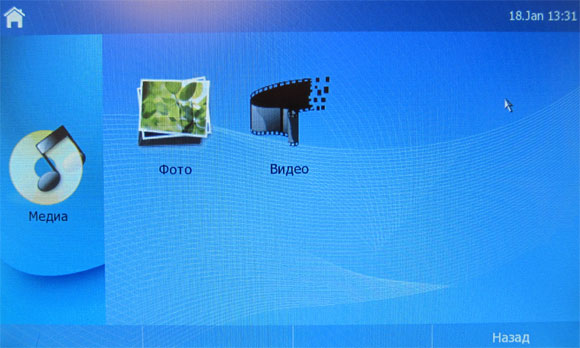Если щелкнуть по пиктограмме "Медиа" - появляется меню для показа изображений или воспроизведения видео. Мультимедийные файлы могут находиться на подключенной по USB флешке или на SD-карте (напоминаю, у аппарата есть кардридер).