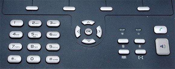 В левой части телефона - обычный номеронабиратель. В центре - традиционный джойстик с центральной кнопкой "ОК". В правой части: включение/выключение видеокамеры, включение/выключение микрофона, вызов телефонной книги, включение/выключение режима "не беспокоить" (DND).