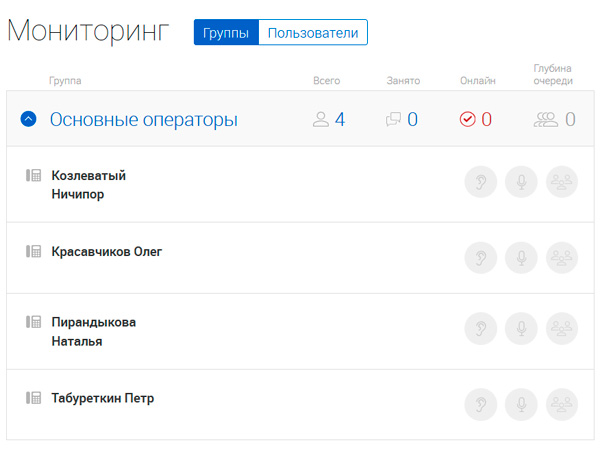 К пользователю, находящемуся на линии, можно подключиться для скрытого прослушивания, для режима "Суфлер" (когда пользователь вас будет слышать, а клиент - нет), также их можно объединять для проведения конференций.
