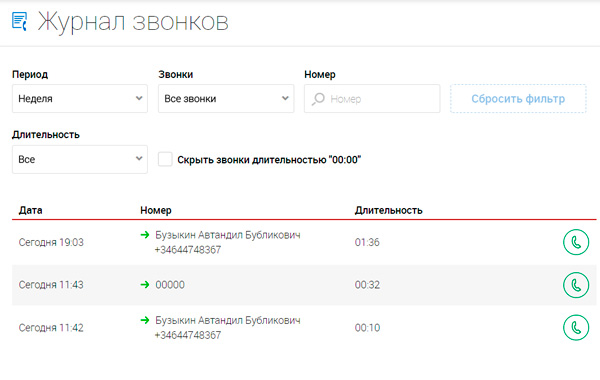 Раздел "Статистика" - подробная статистика по звонкам с отбором по фильтрам, статусами и возможностью прослушать записанный разговор.