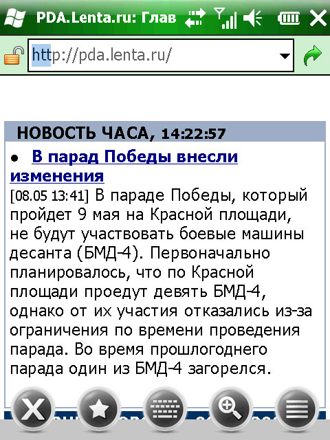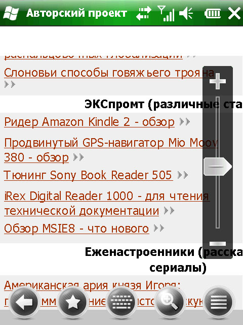 Внизу появились пиктограммы, которые позволяют работать пальцем. Однако та же пиктограмма фаворитов ведет на обычный мелкий список, с которым можно работать только стилом. Вот только пиктограмма масштабирования сделана грамотно - с ее помощью удобно менять масштаб отображаемой страницы.