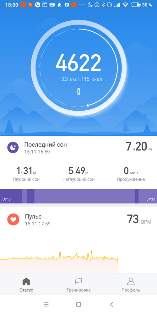 Главное окно: количество шагов, километры, килокалории, сон, пульс.