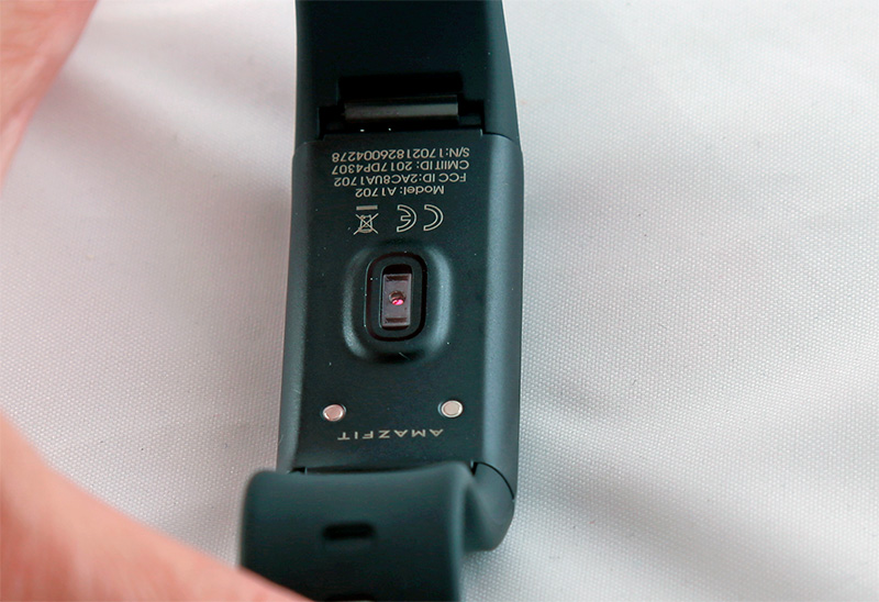 На нижней части браслета - датчик сердечного ритма и два контакта для зарядки.