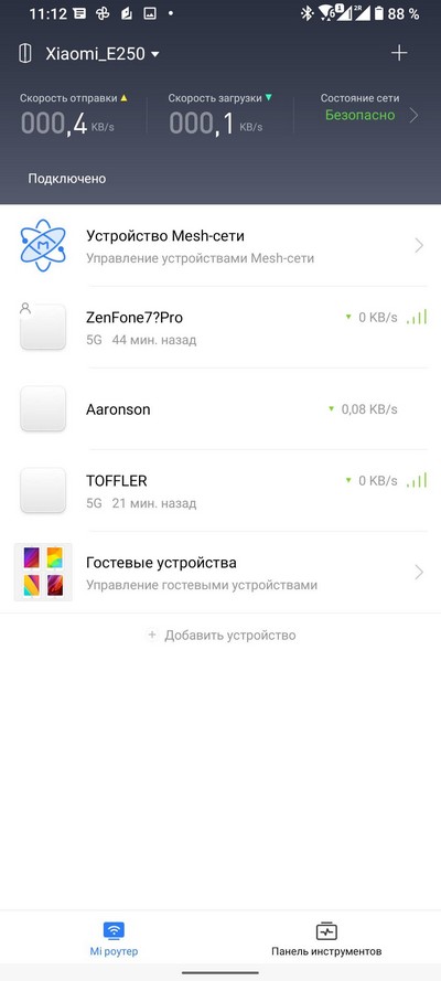 На главной странице выводится статистика по текущим скоростям, есть раздел для подключения устройств Mesh-сети (для создания единой бесшовной сети Wi-Fi), которая здесь поддерживается, также показываются подключенные домашние и гостевые устройства.