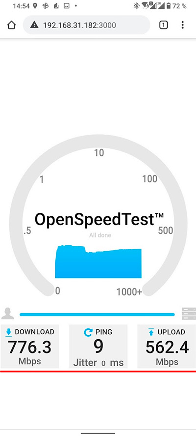 Как я это делаю? Ноутбук кабелем подключаю к роутеру (потери скорости практически не будет). На ноутбуке устанавливаю OpenSpeedTest и запускаю. Программа выдает соответствующий адрес в локальной сети, по которому можно проверить скорость.