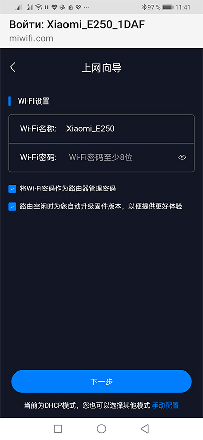 Первичное подключение будет на китайском с иероглифами (как и с роутером Redmi AC2100), потому что это китайская версия, глобальной версии пока еще нет, но пусть вас это не пугает: там сначала нужно нажать синюю кнопку снизу, затем во втором окне задать имя сети и пароль (там и с иероглифами все вполне понятно), после чего нажать синюю кнопку снизу.