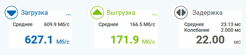 Скорости беспроводной связи тоже порадовали. Но, впрочем, я не буду утверждать, что поддержка Wi-Fi 6 здесь дала какой-то прям вот очень ощутимый прирост в скорости (у моих Keenetic реальные максимальные скорости очень ненамного меньше), но в общем и целом данный роутер себя показал очень достойно: и по покрытию, и по скоростям, и по распределению канала.