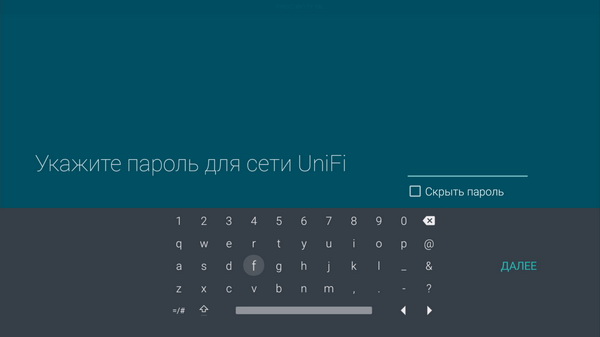 Далее идет подключение к сети Wi-Fi: пароль вводится через экранную клавиатуру и после подключения делается первичная настройка. Также первичную настройку можно сделать с любого смартфона/планшета на Android - приставка сама расскажет, как это сделать.