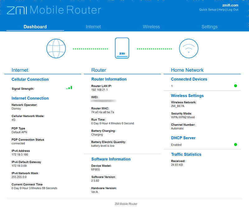Ну и после первичной настройки появляется сама админка: дашборд со всеми данными, настройки Интернета, беспроводной сети и прочие настройки.