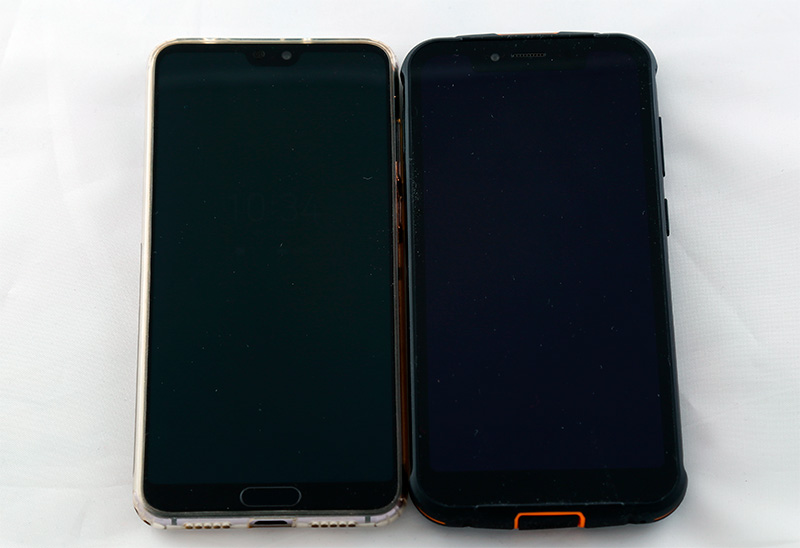 Ну и вот этот смартфон рядом с Huawei P20 Pro. В общем-то, не слишком отличается, и в данном случае даже не сразу можно понять, что это защищенный смартфон. Больше похож на обычный с большой батарейкой и неударопрочный.