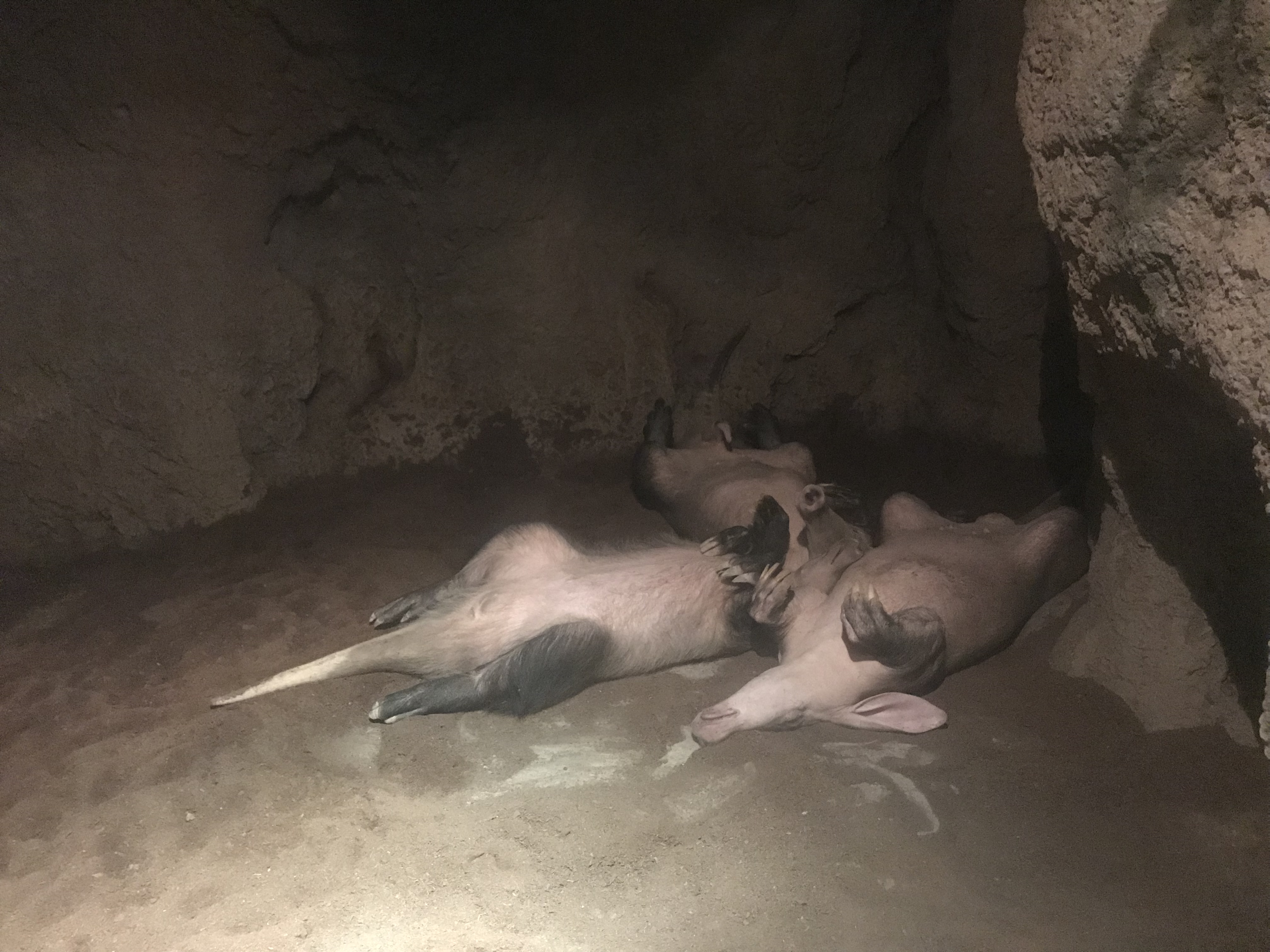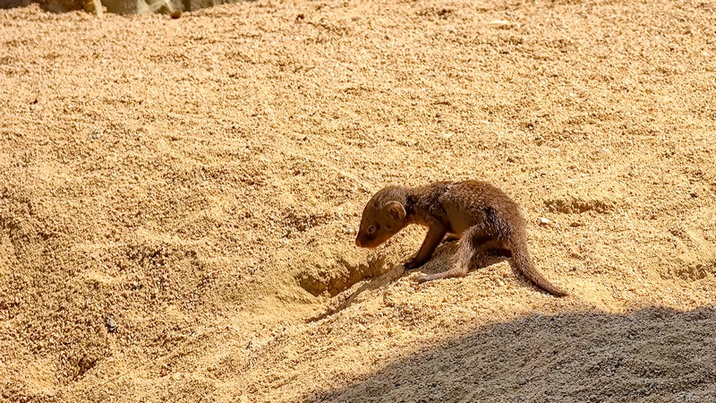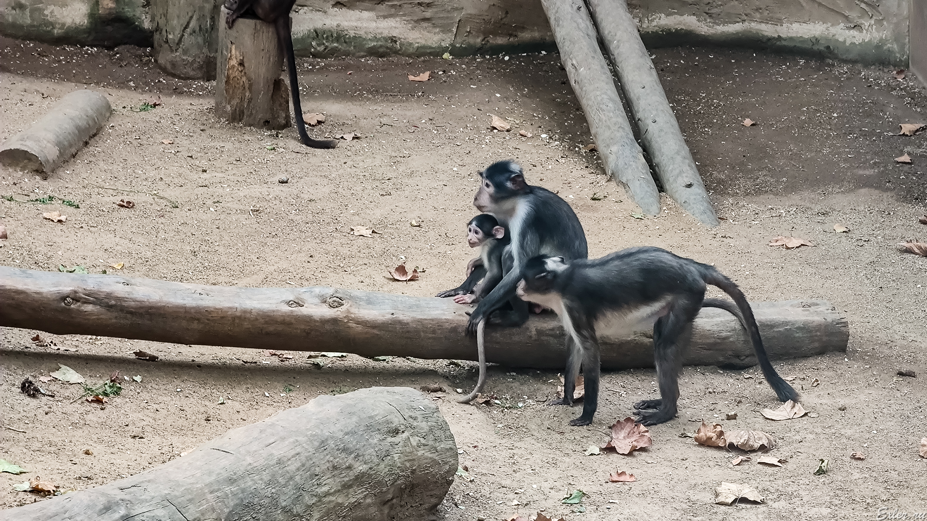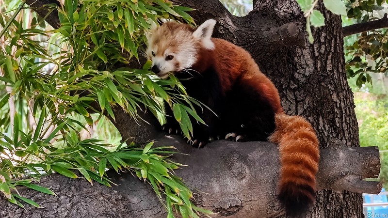 У вольера красной панды (малая панда, или кошачий медведь) обычно толпится народ, но увидеть этого зверька не очень легко: это ночное животное, а днем панда обычно отсиживается в своем домике. Во время предыдущих пяти визитов мы красную панду так и не увидели, только пару раз хвост из домика торчал. В этот раз повезло: она вышла из домика и отправилась полакомиться листьями.