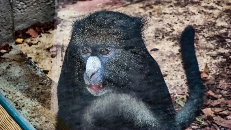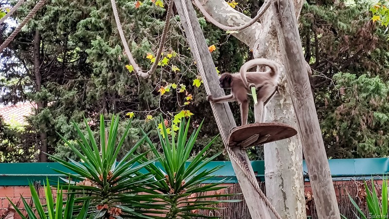 Обезьяна пошла в пристройку, там хвостом ухватила банан и пошла обратно на дерево.