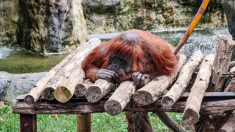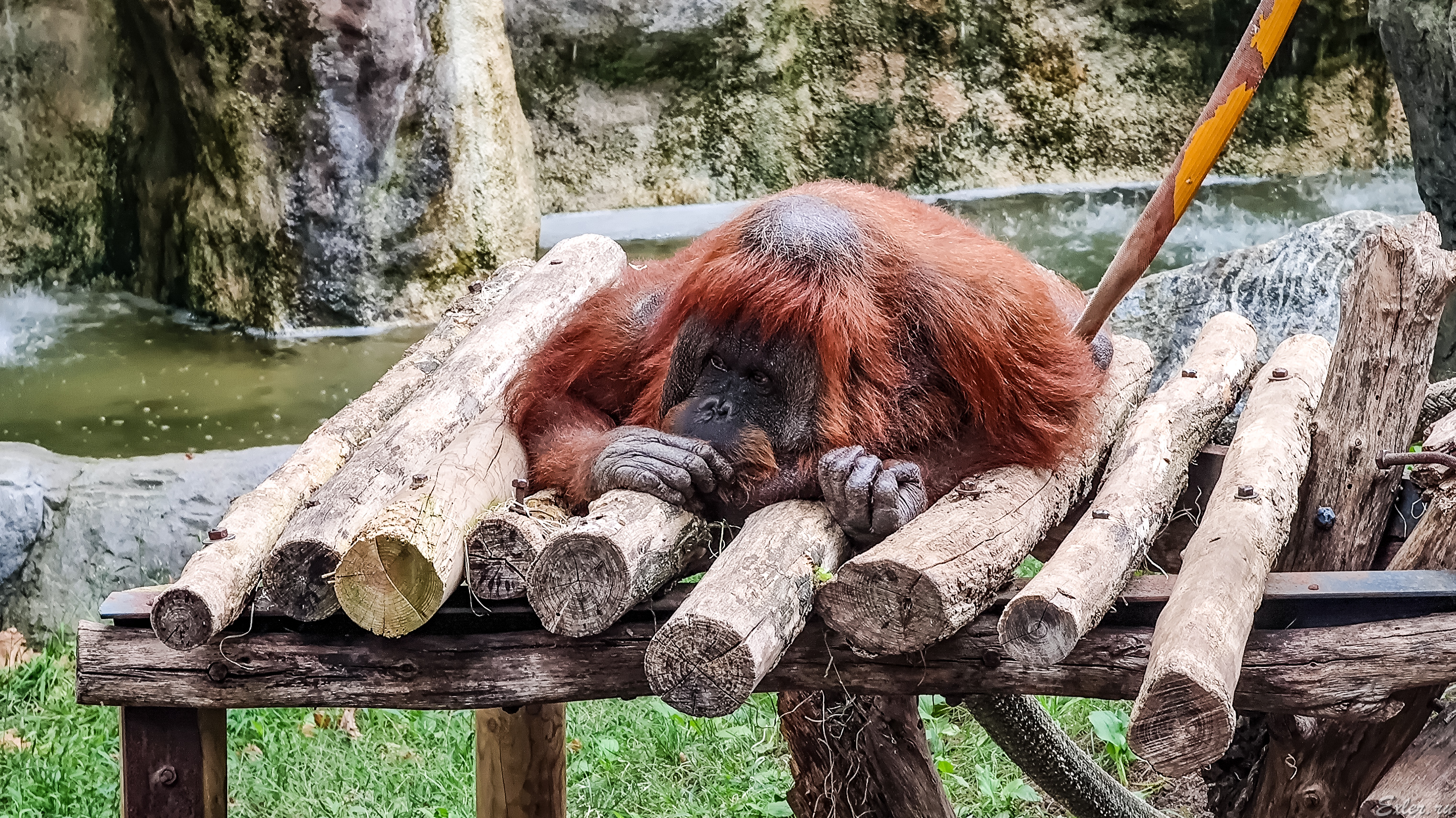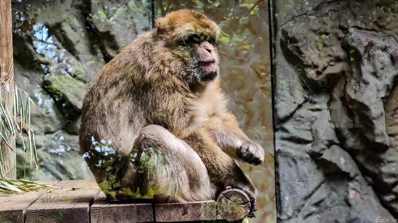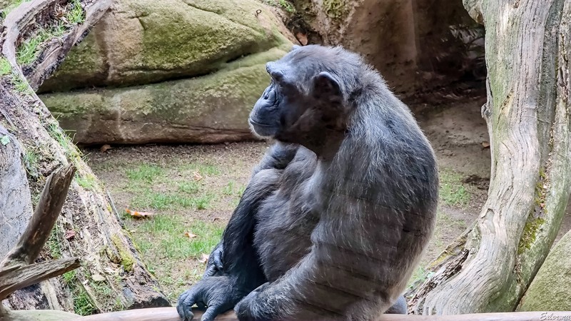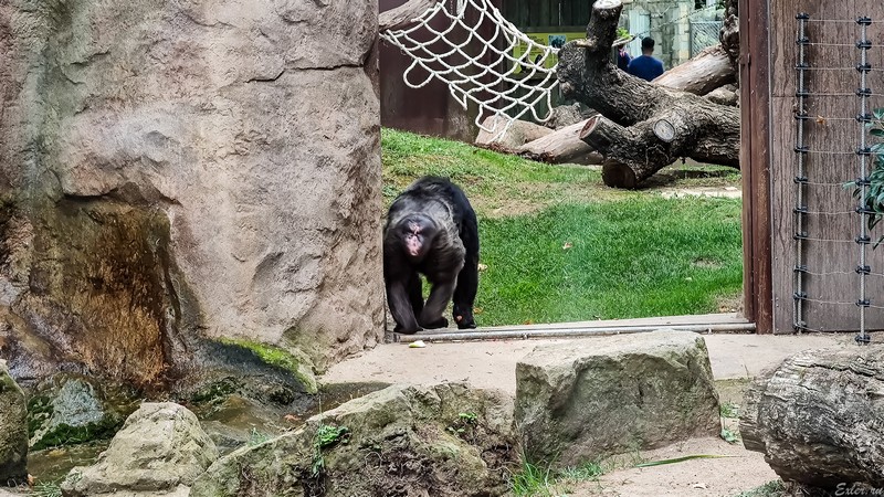 Вольер с семейством шимпанзе. Глава семейства предается легкой поэтической флегме.