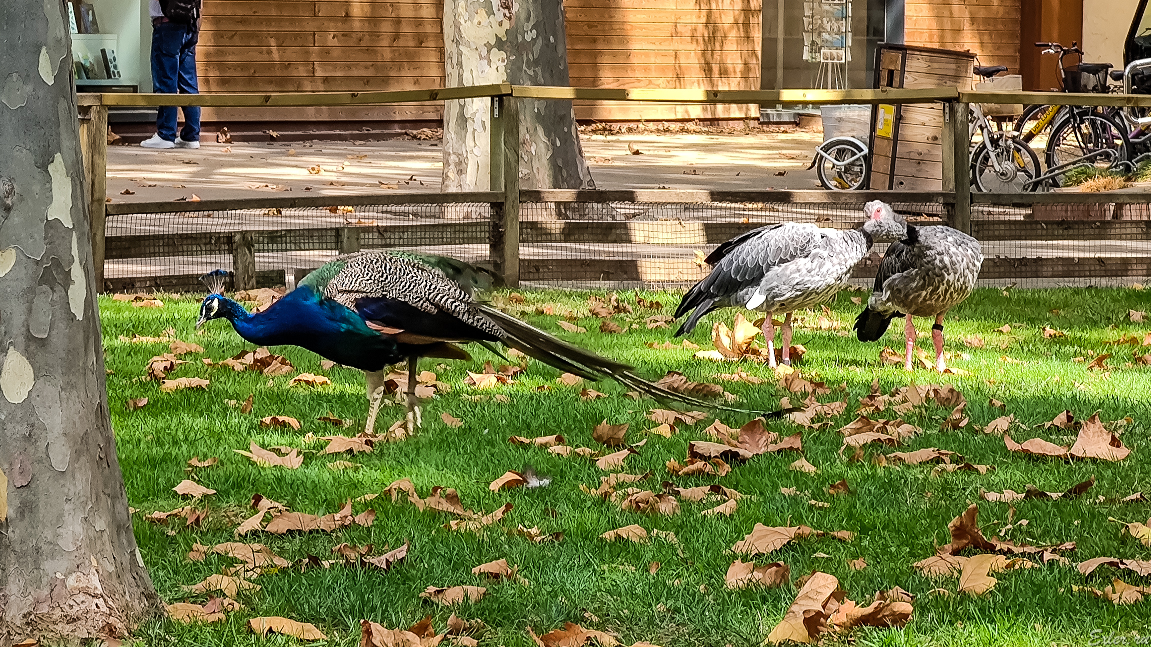 Павлин (они тут свободно разгуливают по территории и людей не боятся), розовые фламинго и другие птицы в открытом вольере.