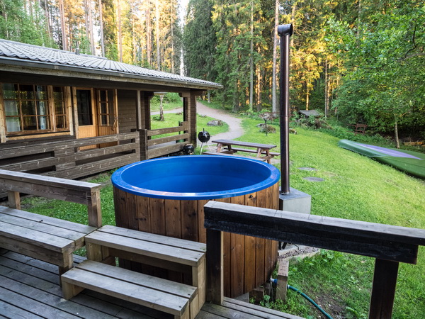 Выходишь из сауны - можешь ухнуть в эту купель, куда наливается очень холодная вода, ну или просто пробежать метров семь до озера и прыгнуть уже в него.