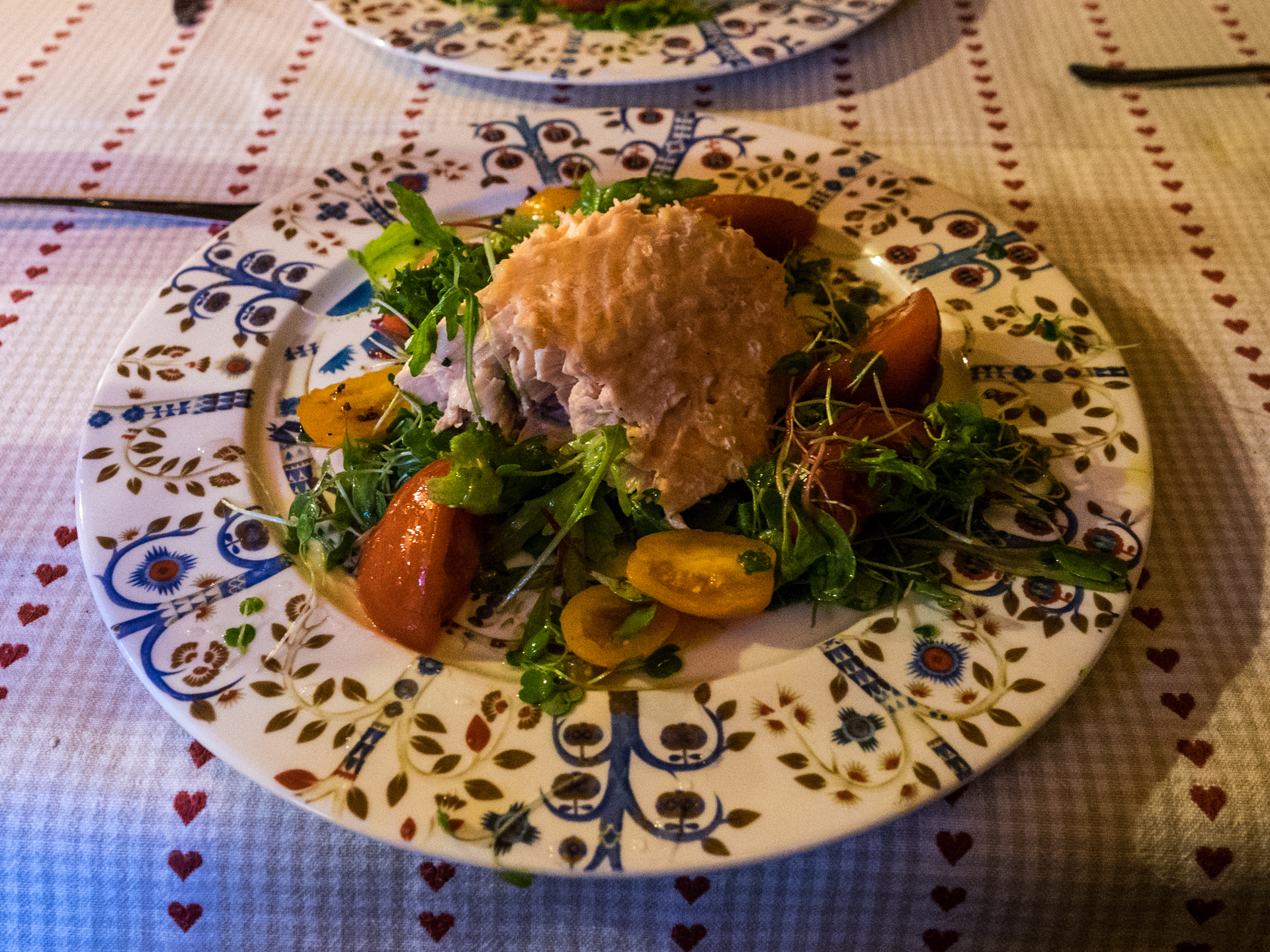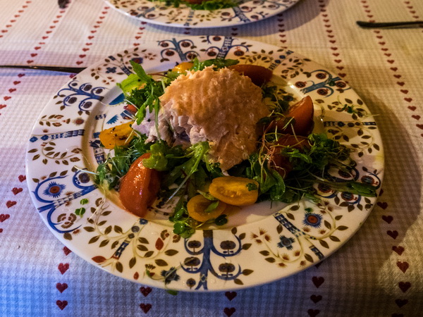 Пекка ушел, вернулся через несколько минут и принес три тарелки с салатом. Так вот, это по уровню приготовления (ингредиенты, соусы-специи) и по вкусноте тянуло на очень крутой ресторан - уж мы сиживали в ресторанах, не сомневайтесь.