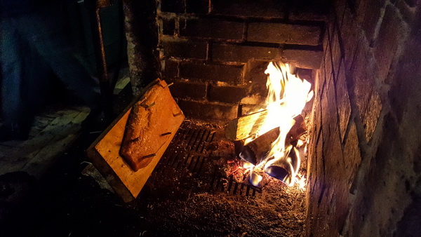 В очаге по старой финской традиции готовился лосось. Делают его очень просто: берется филе лосося со шкуркой, пришпиливается деревянными клинышками к доске, посыпается крупной солью.