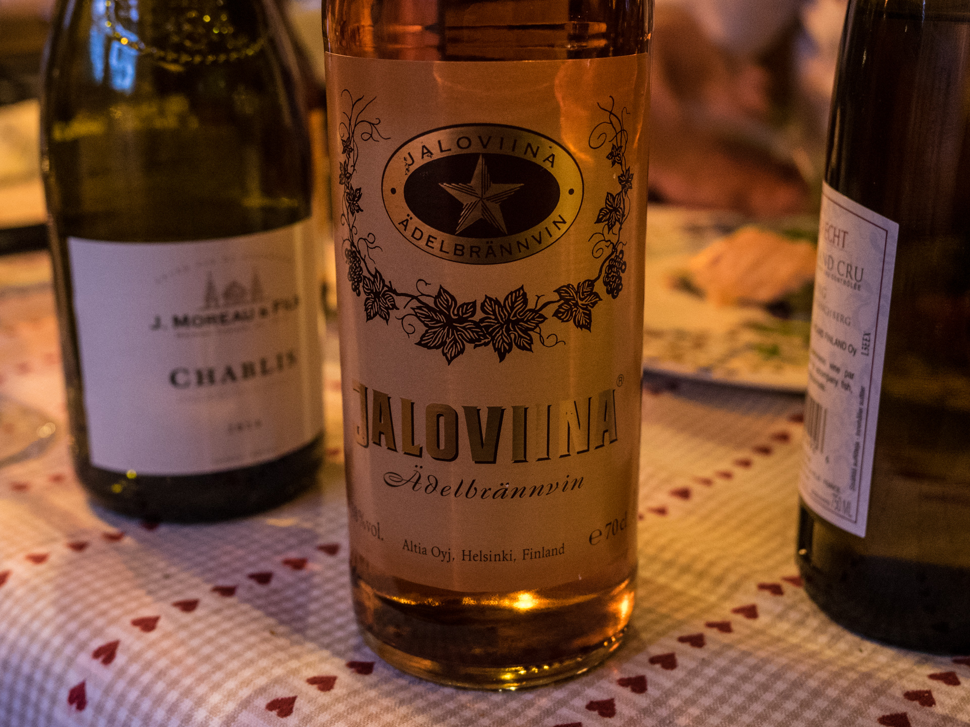 Пекка нам рассказал кучу всего интересного (кроме всего прочего, оказалось, что у него нынешняя жена - из России и он на ней женился совсем недавно), а когда беседа стала совсем задушевной, Пекка вытащил свой главный козырь: национальный напиток Jaloviina (произносится как "Яловийна" или "Яллу"), представляющий собой смесь из двух третей финской хлебной водки и одной трети французского коньяка. Плюс в эту штуку добавляют сахар и карамель (для цвета), так что получается такая "смерть в снегах", что этот напиток может выдержать только настоящий финн. Ну или русский, который по уровню алкогольной закалки вряд ли уступит настоящему финну.