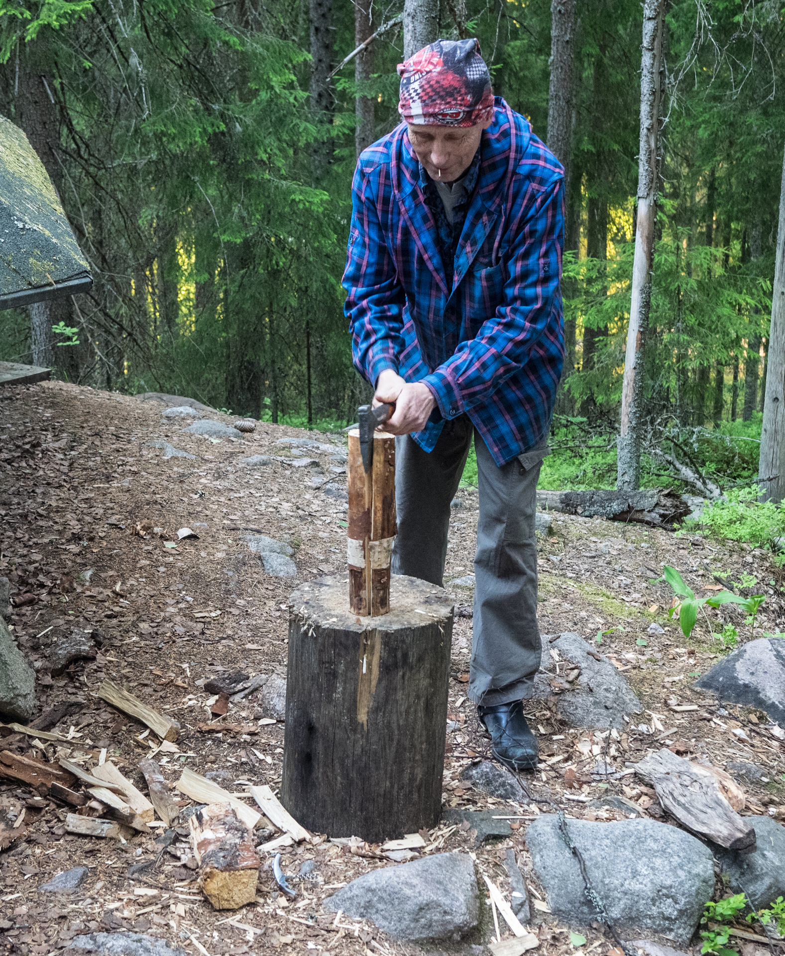 Распаковались, отправились к Пекке. Он нас терпеливо ждал внизу, держа в руках топор. Кстати, совсем небольшой такой топорик, врать не буду.
